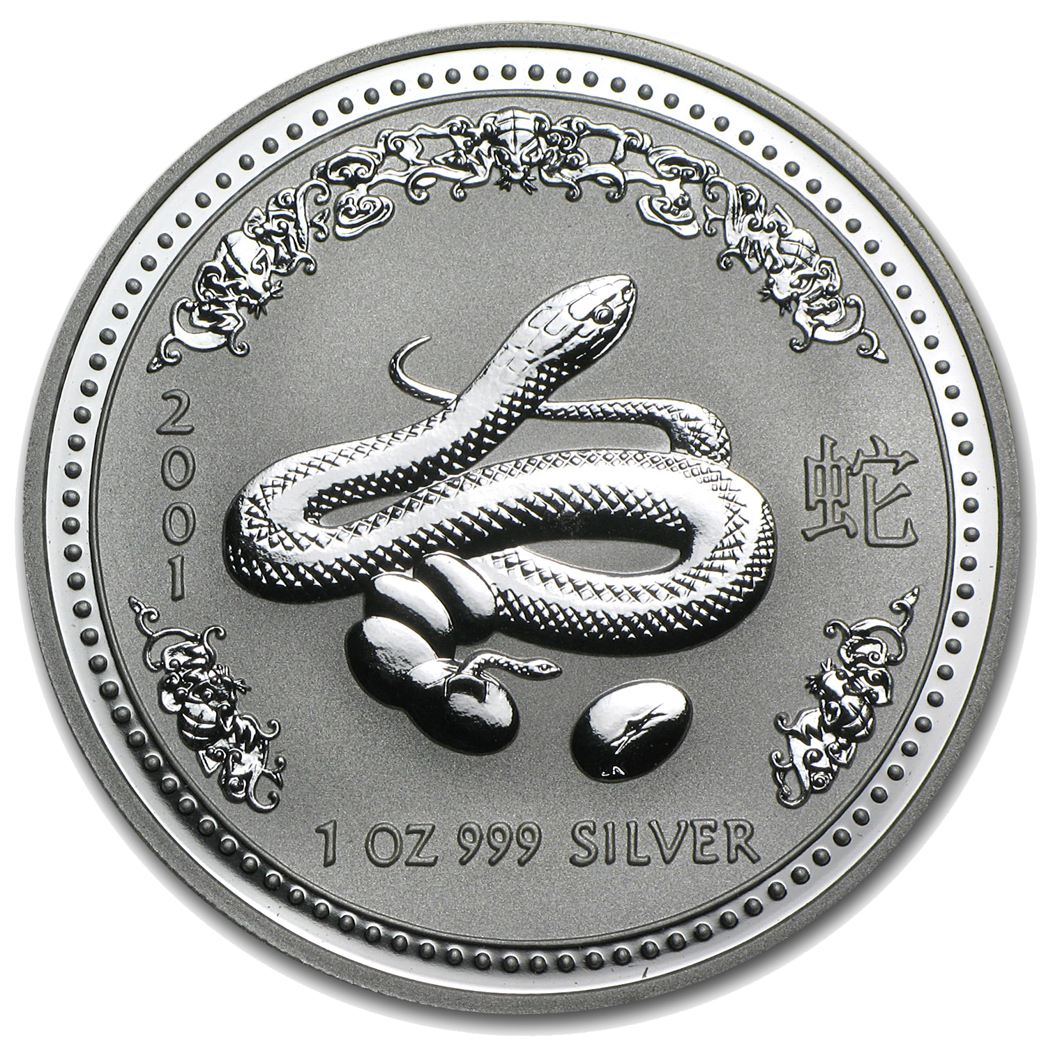 Wie üblich bei der Perth Mint ist auf der Rückseite das wechselnden Motivs der Name des Tieres in chinesischer Schrift, das Prägejahr und Gewicht, sowie der Silberanteil zu sehen.